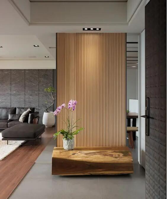 很多屋主不喜歡開門的時候被鄰居看到屋內的樣貌,因此在這個地方設置隔斷屏風便能為家中增添隱私感。圖中的這個隔斷屏風結合了木頭與塑膠的材質,不透明的設計讓家中保有絕佳隱密性。圖中的這個隔斷屏風挖了三個不同大小的圓,巧妙分隔空間的同時卻又有穿透感。