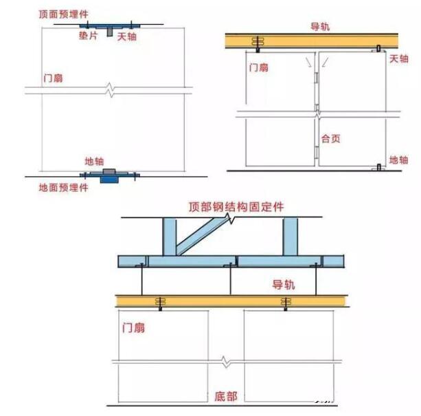 旋轉門和旋轉隔斷的是通過地彈簧和天地軸來實現旋轉的,我們先來簡要的看看它們的通用構造做法: